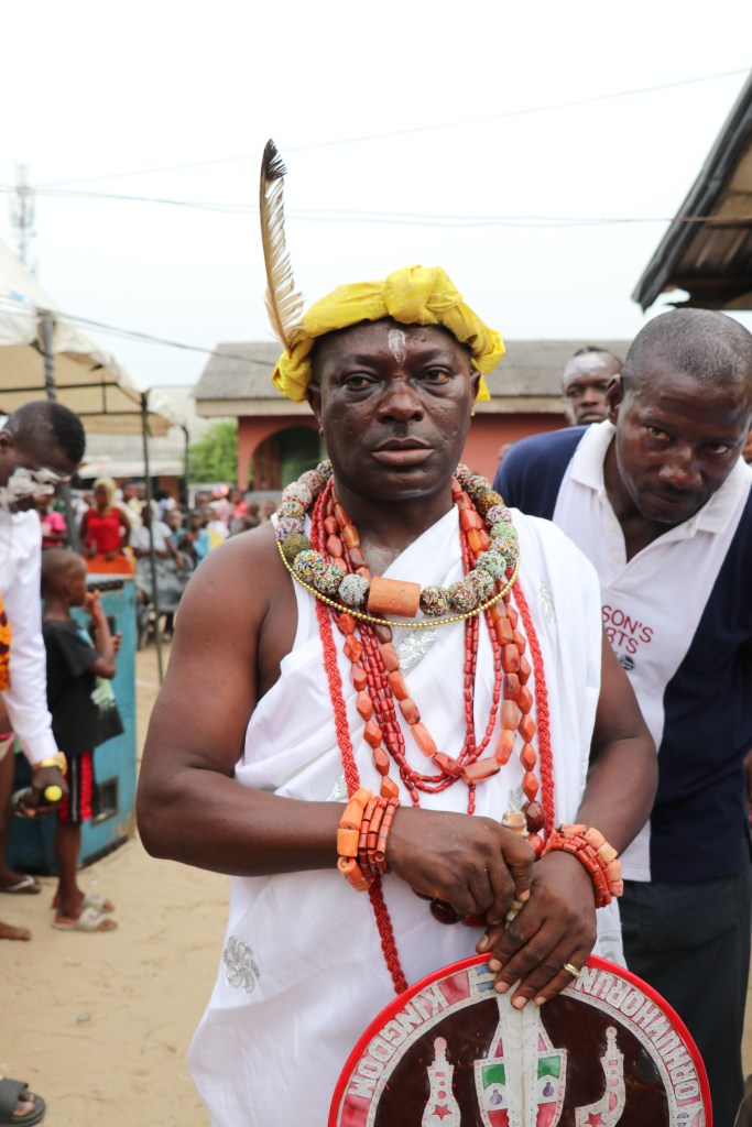 An Urhobo chief wearing traditional beads and a branded chieftaincy hand fan.