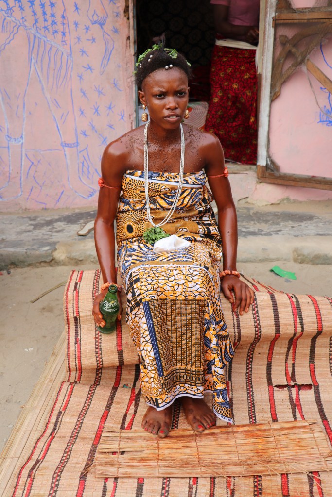 An ọpha (bride) of Orhughworun in Delta State sitting on a bridal mat woven by elderly women of Urhobo. The craft is presently endangered.